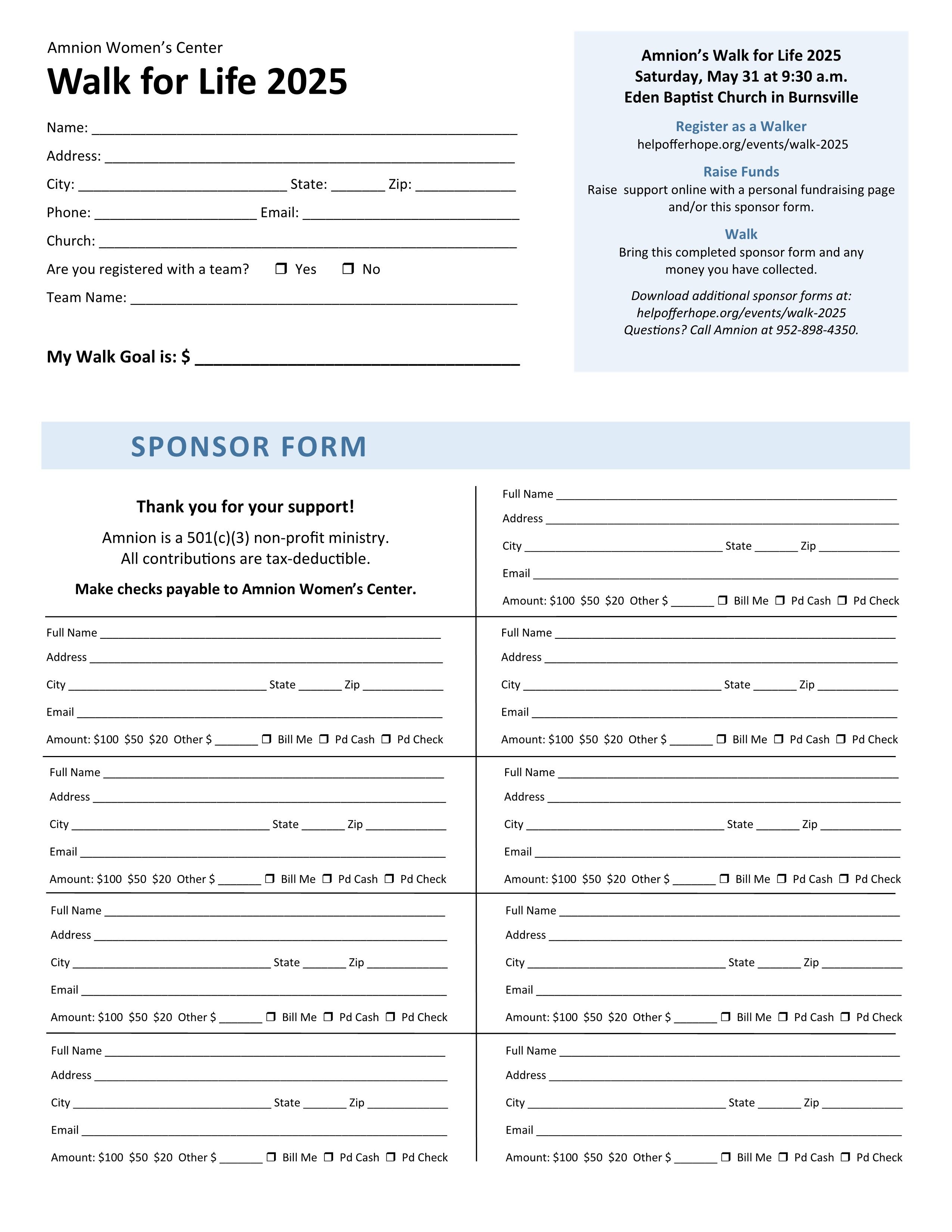 All of Amnion’s funding is community-based, so we are always looking for people, churches and businesses to partner with us financially.